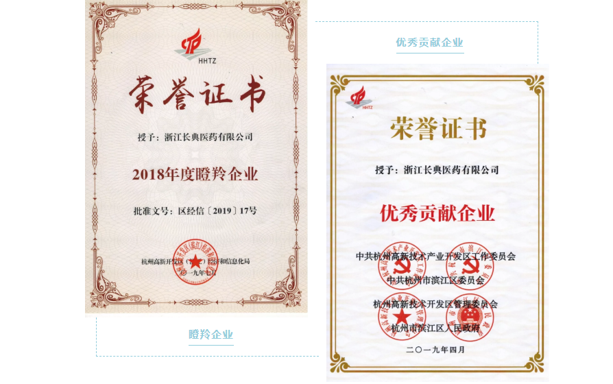 2019年4月,杭州濱江區人民政府授予浙江長典醫藥有限公司濱江區優秀貢獻企業稱號。2019年6月,浙江長典醫藥有限公司被認定為2018年度杭州高新區擁有領先核心技術、創新驅動、高速成長的瞪羚企業。