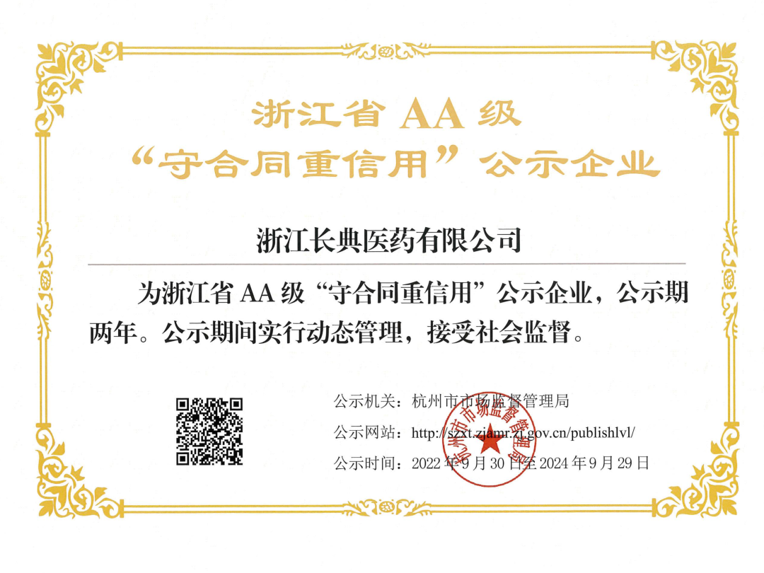 長典醫藥榮獲浙江省AA級“守合同重信…
