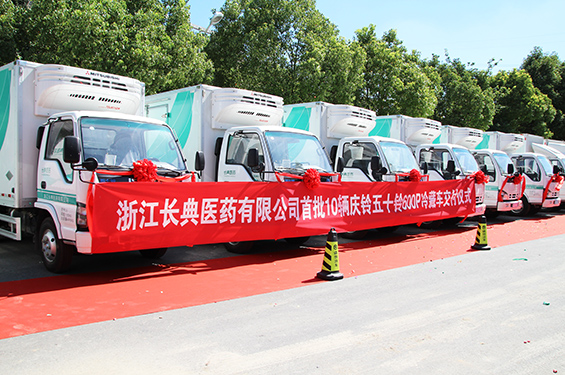 發布時間:2018-07-23 12:00:00 點擊率:2000 通訊員 :2018年7月18日,在浙江金慶鈴汽車4S店,十輛全新冷藏車整齊劃一、排列成排,現場紅地毯、紅繡球喜氣洋洋,“浙江長典醫藥有限公司首批慶鈴五十鈴600P冷藏車交付儀式”的紅色橫幅更是引人注目,新車在交付現場靜靜地等候著主人的到來。