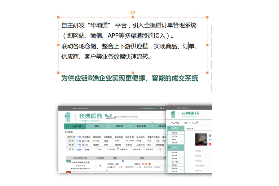 自主研發“華埔道”平臺,引入全渠道訂單管理系統(即網站、微信、APP等多渠道終端接入)。聯動各地倉儲、整合上下游供應鏈,實現商品、訂單、供應商、客戶等業務數據快速流轉。為供應鏈B端企業實現更便捷、智能的成交系統。